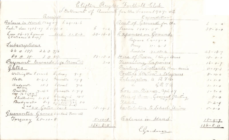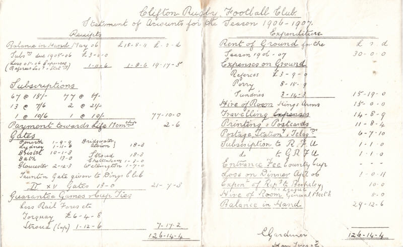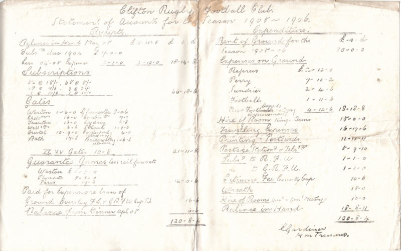 Above club accounts for 1905-06. The biggest gate receipts of the season was for the Bristol match, £10-9-0. Gloucester, Bridgwater and Stroud get bigger gate receipts than Bath. There is still involvement with the Kings Arms as it records that it cost £15 to hire a room there.