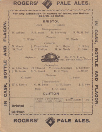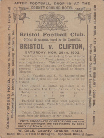 Above programme cover and teamsheet from the Bristol v Clifton match played on 28th November 1903. Bristol won 3-0