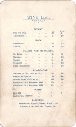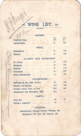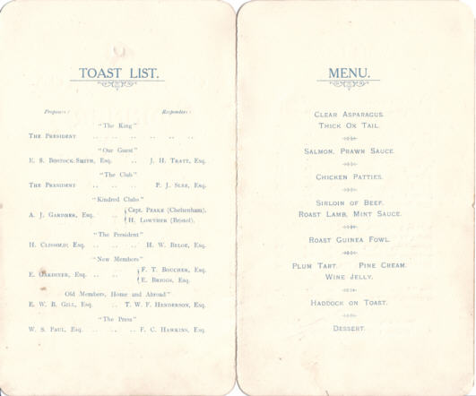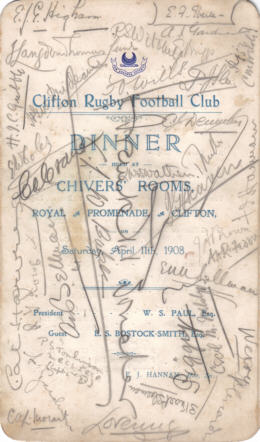 Above signed menu from the 1908 Annual Dinner at the Chivers Rooms.