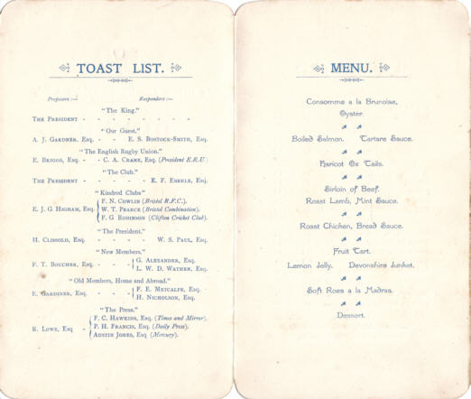 Defeated Gloucester 5-3 at Kingsholm. Later in the season also defeated Bath at the Rec. The win against Gloucester was probably the most memorable victory in the clubs history. Not for over 20 years had Gloucester been beaten at Kingsholm. The side that played for Clifton that day was F.O.Wills, back; E.F.Eberle, E.W.Baker, Claude W.Baker, P.J.Slee, three-quarters; Cecil W.Baker, Leonard W.Baker, halves; A.J.Gardner (captain), J.H.Inskip, V.Green-Armytage, A.V.Boad, A.C.Godwin, E.E.Davies, H.Clissold and E.Gardiner, forwards. The team included 4 Baker brothers. For more click here