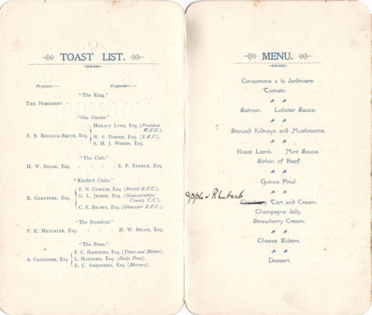 Above signed Menu from the 1909 Annual Dinner held at Chivers Rooms. Signatures identifiable are J.H.Savory, A.J.Gardner, H.W.Beloe,E.F.Eberle, H.Clissold.