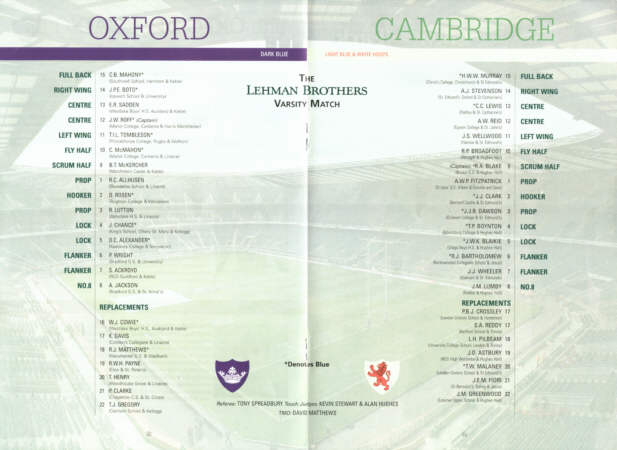 Above program cover and teamsheet from the 2007 Varsity match. Cambridge won 22-16 in front of 34,500 people. James Lumby scored Cambridge's final try.