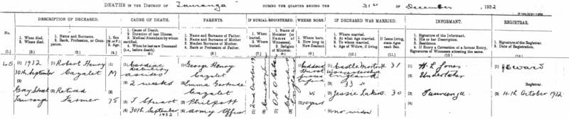 The Death Certificate #3359. Burial Records - Page 24; Date of death 30 Sep 1932; Plot #13; Section #12; Anglican Cemetery. Headstone - Robert Henry Cazalet, 26 Sep 1857 to 30 Sep 1932. Electoral Roll - 1931 - Tauranga - microfiche #101 of 136, Cazalet, Robert Henry, Grey Street, Tauranga, Retired, #1329. There were no other Cazalet listed on the electoral roll in 1931. Local Index - Obituary, Bay of Plenty Times newspaper, 30 Sept 1932 - Cazalet, Robert Henry died 30 Sept 1932 aged 75. He came to Tauranga 11 years ago. During WWI he was involved in the Y.M.C.A. He supported the Beautifying and Horticultural Society, was on the committee and exhibited. He supported the rowing club and was a member of the Tauranga Deep Sea Fishing Club and he belonged to the Church of England.