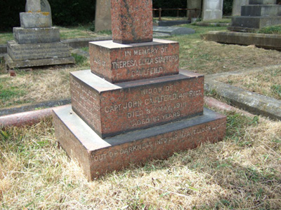 His mother was Theresa Eliza Stafford Caulfeild (nee Caulfeild, his parents were distant cousins) was born on the 15th March 1850 in Bhagulpore, Bengal, India. His parents married on the 1st March 1870 in St.Peter, Eaton Square, London. After the death of John Caulfeild she married Thomas Hennessy on the 29th March 1897 at Colchester Register Office, Essex. She died on the 3rd May 1911 at 1 Kingsway Mansions, Hove, Sussex. She was buried on the 6th May 1911 at Hove Cemetery.