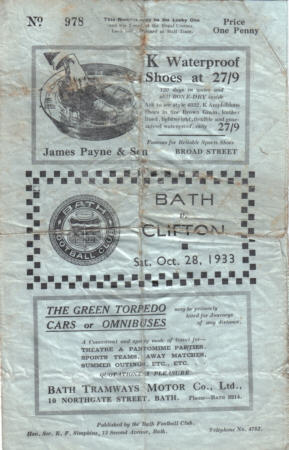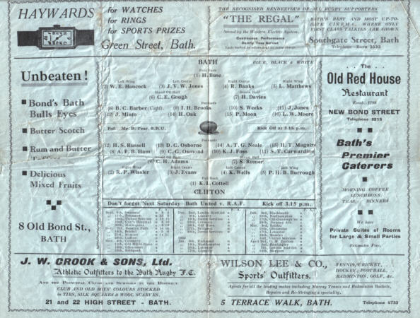 Above programme cover and teamsheet for the Bath v Clifton match played on 28th October 1933. Bath won 21-14.