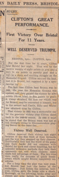 On 28th September 1932 Clifton beat Bristol 8-6. The first time we have won in 11 years. Above newspaper article from the Western Daily Press.