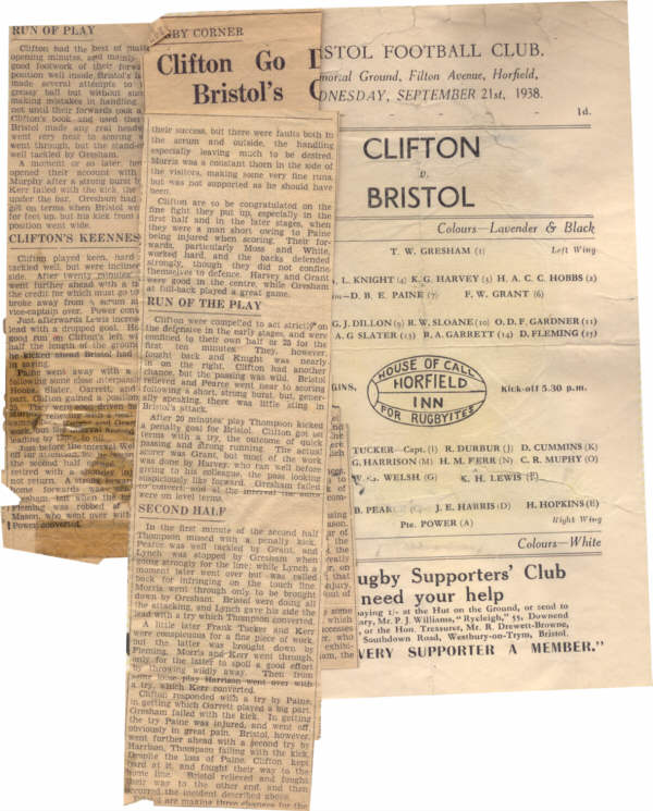 Above progamme and match report of the 1938 Bristol v Clifton match at the Memorial Ground. Image supplied by Jim Gresham