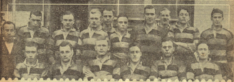 | Back Row (L-R): R.Ainslie, Scruffy Leach, Steve Carwardine, Tiny Neale, H.S.Robinson, ?, Ken Cottell, Dick Peters. Sitting: Ken Wells, Tom Corpe, A.F.B.Ham, Ken Foss, Kit Smith. In Front: Hugh Evans, Pat Mortimer, Tom Mathias. |