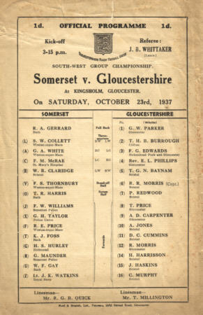 Above programme from the Somerset v Gloucestershire match played on 23rd October 1937 at Kingsholm with Clifton's Tom Burrough in the Glos side.
