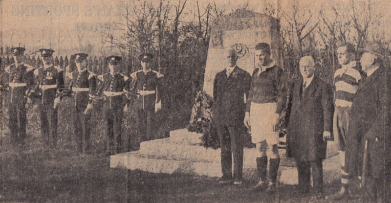 | CLIFTON RUGBY CLUB MEMORIAL UNVEILED. - Mr. Bostock Smith (Bristol RFC), Mr.L.T.Masters (captain of Wellington), Mr Walter Pearce (President of the English Rugby Union), Mr J. de S.Hall (captain of Clifton), and Mr R.E.Bush standing at the memorial after the ceremony. |