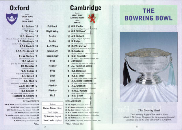 Above programme cover and teamsheet for the 1998 Varsity final with Andy Collins. Cambridge won 16-12.