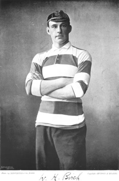 "Rugby Football in the West of England has had a few more energetic exponents than the Captain of Gloucestershire XV., W.H.Birch. Born in South Africa, he went to school at Bath College, so that his early training as a Footballer was also in the West Country. At one time he was Captain of the Clifton F.C., and for six years he has been quite one of the foremost figures in Rugby Football in Gloucestershire. He has played continuously since 1891, and last season acted as Captain of the team. He also played during the winter of 1894-95 for the Western Counties, as well as for London and the Western Counties against the Universities, two of the International trials. Standing just over 6ft. and weighing littleover 13 stone, he is a strong scrummager, using his weight to the best advantage. In addition he is a resolute tackler, while his foot work is of the most brilliant description."
