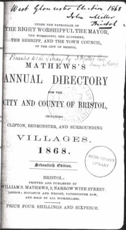 Above on 14th January 1889 his father, John Miller, donated several copies of Mathew's Directory to Bristol Central Library. Above 1868 copy signed by his father. The 1868 Election refers to the General Election which took place on 10th December 1868. The 1868 UK general election was the first after passage of the Reform Act 1867, which enfranchised many male householders, thus greatly increasing the number of men who could vote in elections in the United Kingdom. Nearly triple the number of votes were cast compared to the previous election. The result saw the Liberals, led by William Gladstone, again increase their large majority over Benjamin Disraeli's Conservatives.