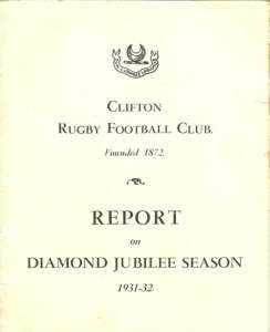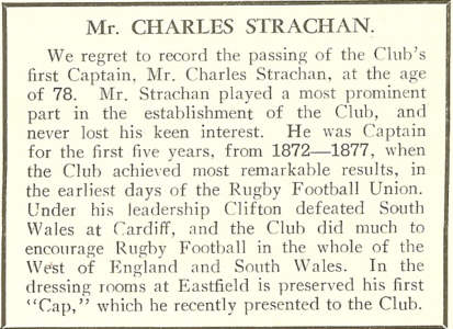 Above the announcement of Charles Strachan's death in the Clifton RFC Diamond Jubilee Report of 1931-32.