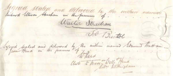 Above the signature of Walter Strachan from an Indenture dated the 24th December 1889 regarding a Lace Factory on Woodborough Road, Nottingham between his father Richard Ellsion Strachan and Edmund Pratt, Jessie Hind and William Lockwood.