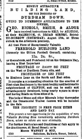 Above a report from the Bristol Mercury dated the 12th August 1896 which advertises the sale the the former ground at Durdham Down and Henleaze Lane.