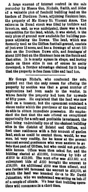 A report on the sale of the land from the Bristol Mercury on the 14th August 1896. The land was sold for £16,500