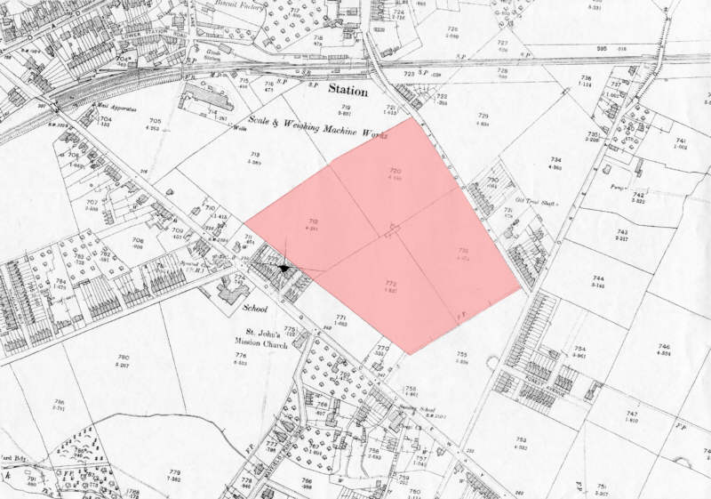 Above 1912 map of the area with road layouts marked on possible location of ground.