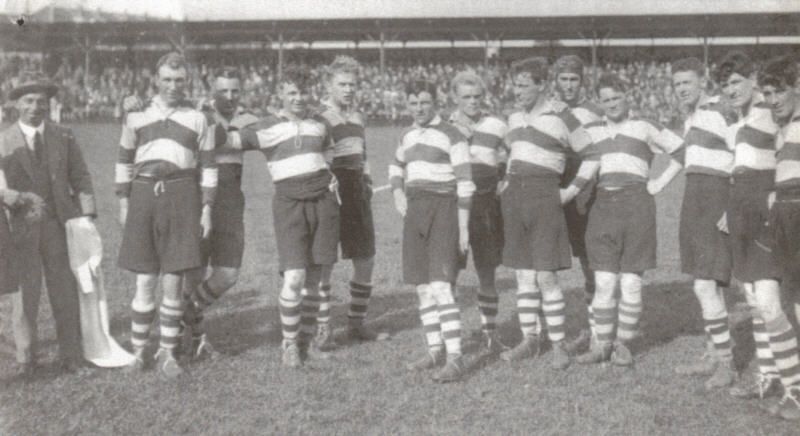 The Bristol side stop for the photographers at half time in the first match of the 1923-24 season v Cinderford on September 15th 1923. Bunny Chantrill is 7th left. Bristol won 13-11