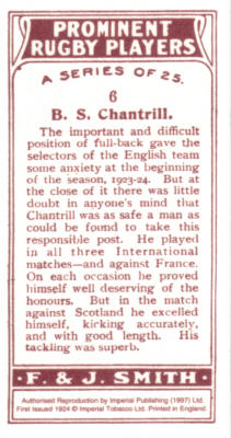 On 4th February 1919 Lieutenant Chantrill played in a RAF rugby trial match at Blackheath for the South-East v South-West. The South-West won 14-13