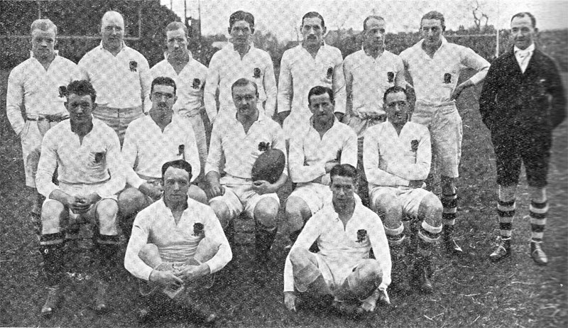 Standing (L-R) B.S.Chantrill (Bristol), R.H.Hamilton-Wickes (Harlequins), H.P.Jacob (Oxford University), H.C.Catcheside (Percy Park), R.Cove-Smith (O.M.T's), C.K.T.Faithfull (Harlequins), Sitting: L.J.Corbett (Bristol), G.S.Conway (Rugby), E.Myers (Bradford), W.W.Wakefield (captain) (Leicester), A.T.Voyce (Gloucester), A.F.Blakiston (Liverpool), W.G.E.Luddington (Devonport Services). On Ground: A.Robson (Northern), A.T.Young (Cambridge University). |