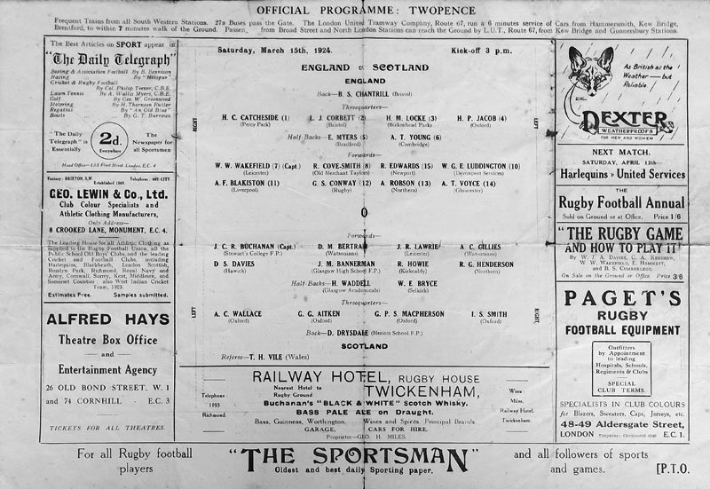 Above programme from the 1924 England v Scotland match played on 15th March 1924. Image courtesy Roy Hough