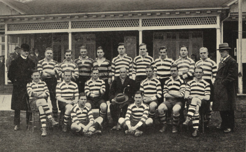 Standing (L-R) B.S.Chantrill, R.Edwards, W.D.Luddington, H.P.Jacob, A.F.Blakiston, H.M.Locke, H.C.Catchside, A.E.Freethy (Referee). Seated: A.T.Voyce, R.Cove-Smith, W.W.Wakefield, E.Myers, L.J.Corbett. On Ground: A.Robson, A.T.Young. (G.S.Conway not in group). |