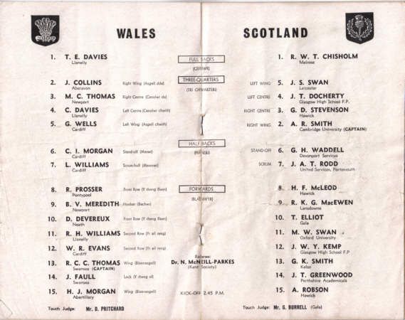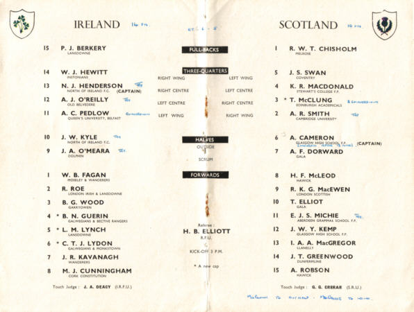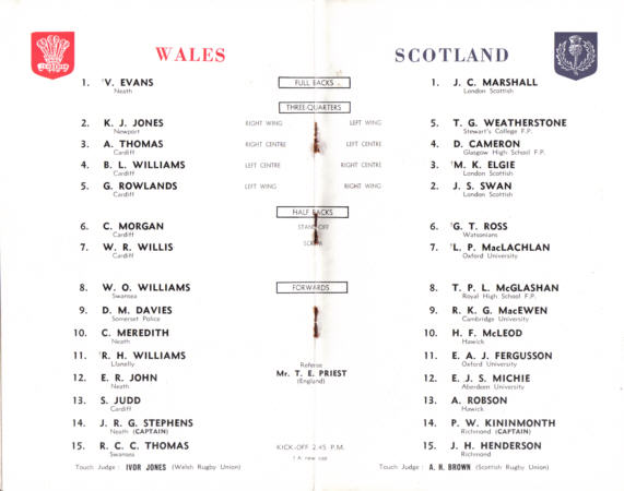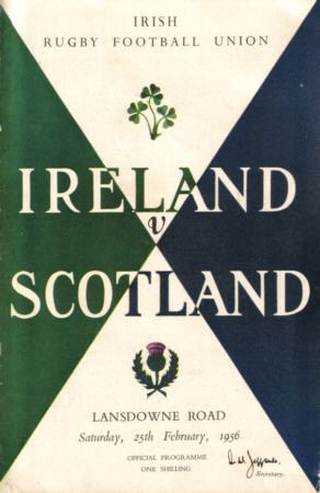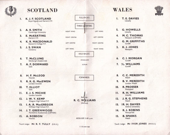 Above programme cover and team sheet for Robert MacEwen's 8th cap for Scotland. This was also John Currie's 3rd cap for England v Scotland on 17th March 1956. He scored 2 penalties and 1 conversion in this match.