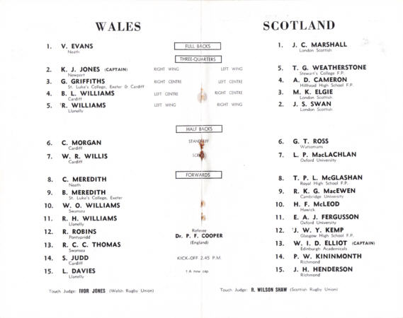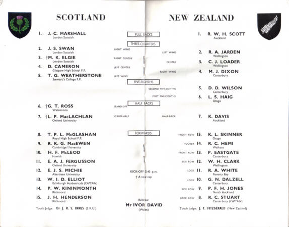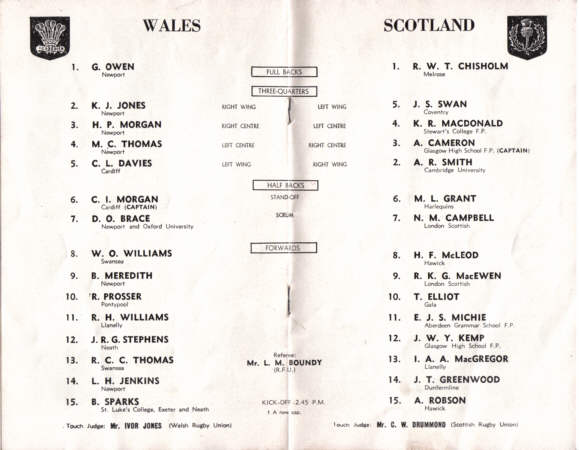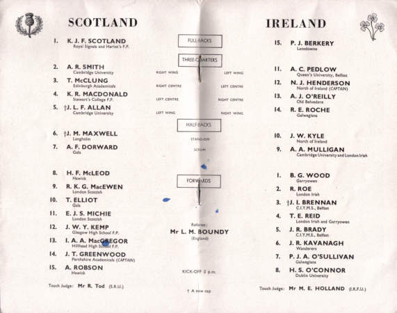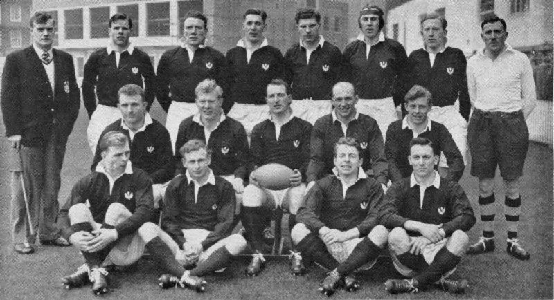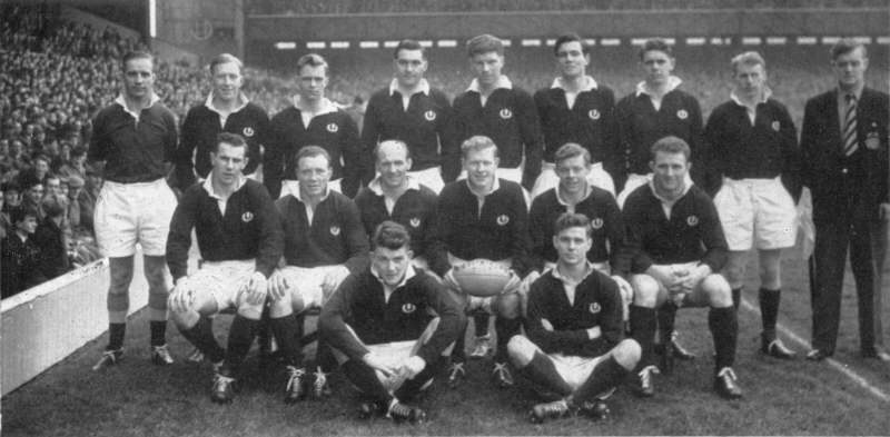 | Back Row (L-R): Mr.L.M.Boundy (Referee), J.S.Swan (Coventry), I.A.A.MacGregor (Llanelly), J.W.Y.Kemp (Glasgow HSFP), A.R.Smith (Cambridge University), T.Elliot (Gala), J.T.Greenwood (Perthshire Academicals) (Captain), E.J.S.Michie (London Scottish), G.D.Stevenson (Hawick), A.Robson (Hawick), R.K.G.MacEwen (London Scottish). Front Row: E.McKeating (Heriot's FP), H.F.McLeod (Hawick), A.F.Dorward (Gala), M.L.Grant (Harlequins), K.J.F.Scotland (Royal Signals, Catterick, and Heriots FP). |