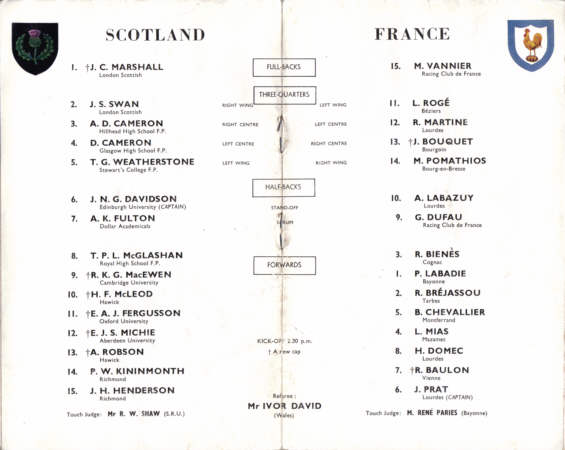 played France on the 12th January 1957 at Stade Colombes, Paris. Scotland won
