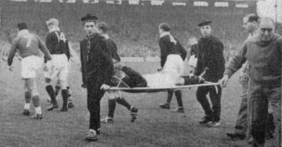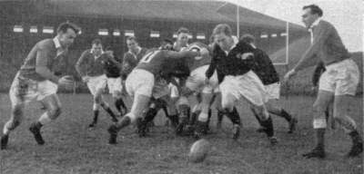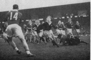Action from the France v Scotland match on the 12th January 1957 at Stade Colombes, Paris. Above left J.T.Greenwood has tackled one Frenchman and T.Elliot and R.K.G.MacEwen set off for another. Above right A picture which might have had a tragic ending for Scotland. R.K.G.MacEwen is carried off on a stretcher. Happily, he was able to return.