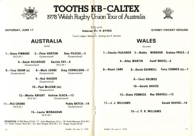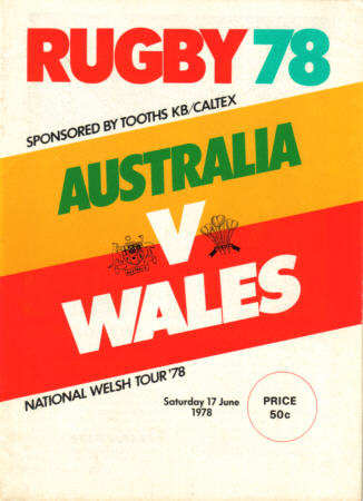 Above programme cover and teamsheet from the Australia v Wales match played on 17th June 1978. Australia won 19-17. Gareth Evans was a substitute in this match and replaced Alun John Donovan. The team listing for Wales is incorrect. He fractured his cheek bone in this match.