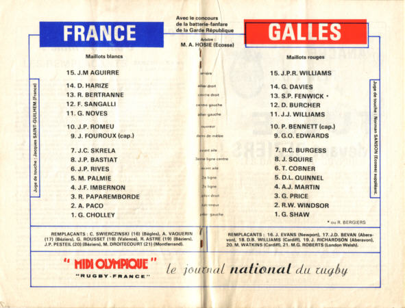| The Players - J.P.R. Williams, Gerald Davies, Steve Fenwick, Ray Gravell, J.J. Williams, Phil Bennett, Gareth Edwards, Charlie Faulkner, Bobby Windsor, Graham Price, Allan Martin, Geoff Wheel, Jeff Squire, Terry Cobner, Derek Quinnell, Gareth Evans, (need to sort out whos who) |