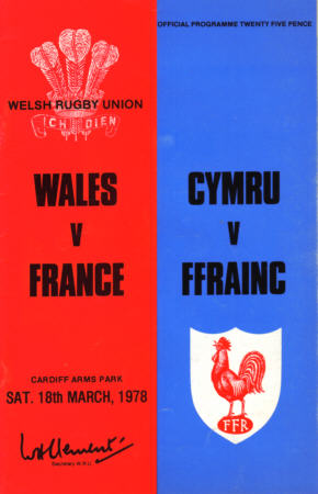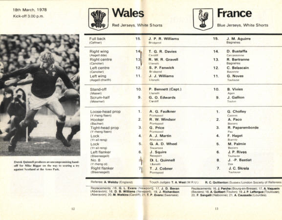 Above programme cover and teamsheet from the Wales v France match played on 18th March 1978 which clinched the Grand Slam for Wales. Evans is listed as substitute but was in the starting line-up on the wing. Wales won 16-7 in front of 52,000. This is the only match that Evans started. His other 2 Welsh caps were gained as a reserve.