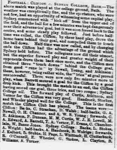 The first match played was against Sydney College, Bath at the College grounds in Bath. Playing 15 a-side at a time when 20 a-side was the norm. There were no referees and the laws of the game decreed that "the captains of the respective sides shall be the sole arbiters of all disputes". Clifton won by 1 goal, 3 tries and 2 touches to nil. The book 'Fifty Years with the Clifton Rugby Football Club" list that first team as