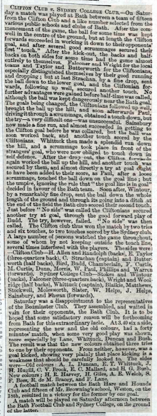 Clifton continued to play Sydney College and then Bath College, as it became know. The school got into financial problems and tried to borrow money off Bath Town Council in September 1909. By 24 votes to 14 a scheme to advance the college £8,000 at 31/2% and to make an annual grant of £300 in lieu of the grants under the existing scholarship scheme was rejected. The staff were given notice and the college closed during Christmas 1909.
