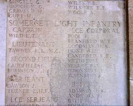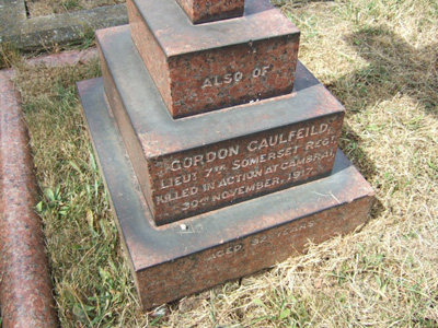2nd Lieutenant Gordon Caulfield of the 7th Battalion Somerset Light Infantry was killed on 30 November 1917 when the Somersets were overwhelmed in la Vacquerie valley. His body, found a fortnight later by the Royal Irish Fusiliers, was buried nearby, but the location was lost in the fighting. He is commemorated at the Cambrai Memorial, Louverval, on Panel 4.