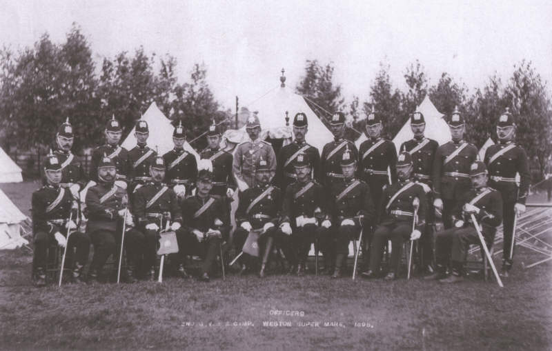 | Back Row (L-R): ?, Seymour Williams, Egerton, Tom Board, Gilbert Rudman, Tom Cartwright, Fuller, Stanley Sinnott, Spark Evans, Stockley Sinnott, Hutchinson, Thompson. Front Row: Capt. Gardiner, Harold Lewis, James Rudman, Lt. Col. Purchase (Inspecting Commandant R.E.), Col. Plant, Capt. Horniblow (Adjutant), Col. George Gibbs (later the 1st Lord Wraxall), Jolly, Capt. Martin. |