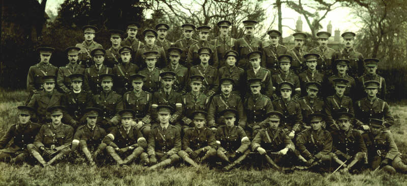 3rd Row: ?, Vipan, Rawlins, MacMurtree, Gibbs, Vowles, Holbrow, Williams, Long, Bennett, Haskins, Hunter, Knee 2nd Row: MO, Charlie Chaplin, Warr, Owen Davies, Heaven, Langley, Seymour Williams (the CO), C Hosegood, Cecil Wills, Whitwill, Fitzgerald, Harry Savory. Front Row: Claude Bostock Smith, Corbett Slee, Rogers, Braisher, ?, Mitchell Clark, ?, Barrett, Edwards, Stratton Davies, S Jones |