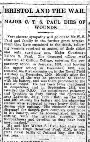 Very sincere sympathy will go out to Mr W.S. Paul and family in the further great bereavement they have sustained in the death following wounds received in action of their eldest and only surviving son, Major Courtney Talbot St Paul. The deceased officer was educated at Clifton College, entering prep school in June 1891 and leaving the Upper School in December 1898 and received his first commission in the Royal Field Artillery in January 1900. Shortly after the outbreak of the War he proceeded to France with his battery and was there promoted to the rank of Major. He has been twice mentioned in Despatches and in September 1916 was awarded the DSO. ‘For conspicuous gallantry and devotion to duty during the operations near Lavantie July 1916’
