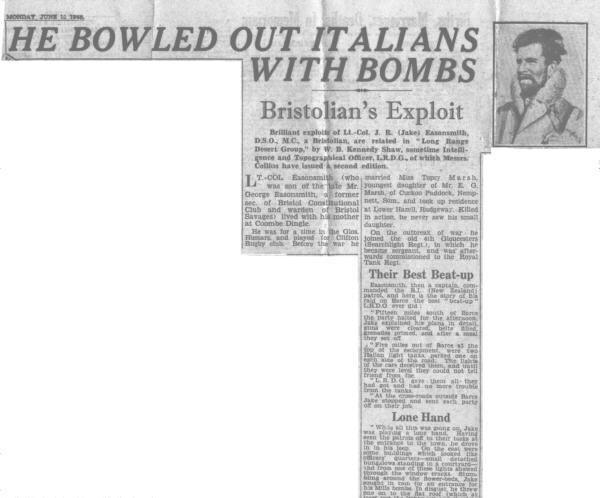 Above the Bristol Evening Post of June 11th 1945 ran a piece on Jake Easonsmith with the headline "He Bowled Out Italians with Bombs". The Western Daily Press also ran a piece on April 5th 1945 with the headline "Jake Dessert Ranger"
