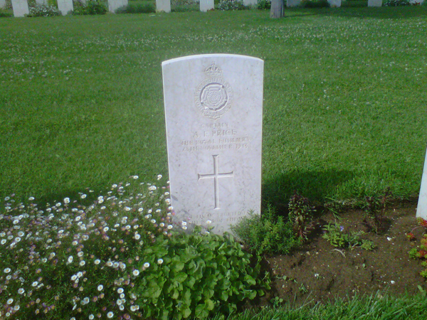 Captain Anthony Frederick Price - Royal Fusileers (City of London Reg.) Service Number 129422 Killed on 28/11/43 Buried in Sangro River War Cemetery, Italy (same as Llewellyn Campion Wood, also of the same Regiment killed on the day after.) Grave Ref. X1.E.34 Next of Kin: Stephen Alfred and Lillian Maud Price, of Westbury-on-Trym, Gloucestershire.