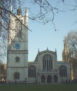 Above St. Margarets Church, Westmister. The church is located immediateley north of Westminster Abbey. It has been the place where many famous people have married Samuel Pepys, John Milton, and Winston Churchill.