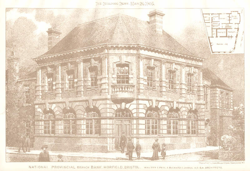 Above a drawing of the National Provincial Bank in Horfield by the Architects Walter S. Paul and Richard C. James from The Building News, 24th March 1905.