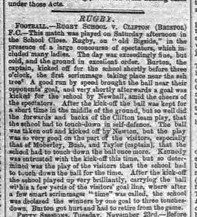 | 20 Nov 1875 | Rugby School | Away (Old Bigside) | E.J.Taylor (captain), J.D.Miller, W.O.Moberley, A.Kaye-Butterworth, W,Gribble, A.W.S.Young, A.H.Allen, A.Budd, G.T.Budd, J.A.Bush, R.E.Bush, J.Curtis, J.H.Dunn, T.H.Fisher, F.Morris, W.S.Paul, E.Phillips, A.A.Plant, J.G.Thomson, W.E.Webb | D.F.Burton (captain), J.Turner, W.Richardson, F.E.Speed, A.C.Child, T.Hone, F.J.Newton, C.A.Tennant, C.M.Kennedy, C.Ward, F.Wallerstein, W.Mothersill, W.L.Agnew, J.Turner, H.F.Newhall, H.S.Bennett, W.D.Menzies, W.J.Hughes, W.Y.Perot, P.H.Chapman, A.R.Greenwood | 1Tr,3To-1G | Lost |