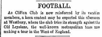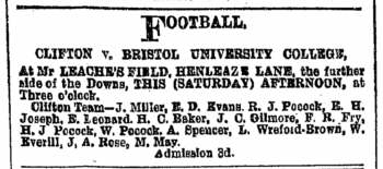 | 28 Nov 1885 | Clifton College | Away | 2G,3To-2G,1To | Draw (in favour of Clifton) | ||